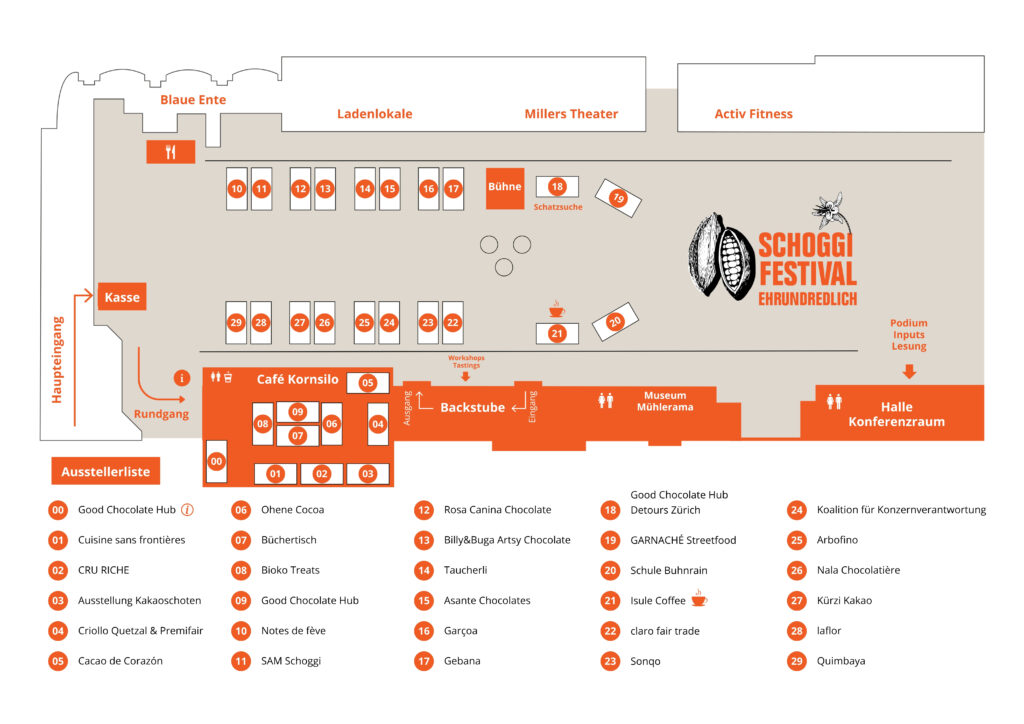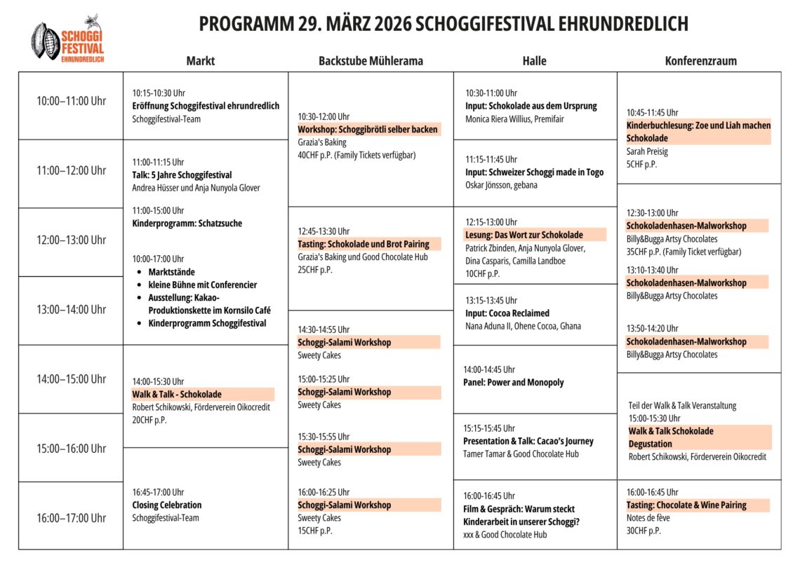 Schoggi-Markt, Podien, Workshops, Degustationen, Kinderprogramm, Vorträge, Lesung, Schoggi-Talks, Mitmachaktionen, kulinarische Leckerbissen, viel Wissen rund um die Themen Kakao und Schokolade, Essen und Getränke und mehr.