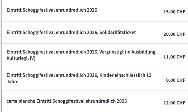 Programm & Tickets Programm und Tickets Das war das Schoggifestival-Programm im letzten Jahr 2025. Das Programm für 2026 folgt zeitnah. Stay tuned → Programm herunterladen